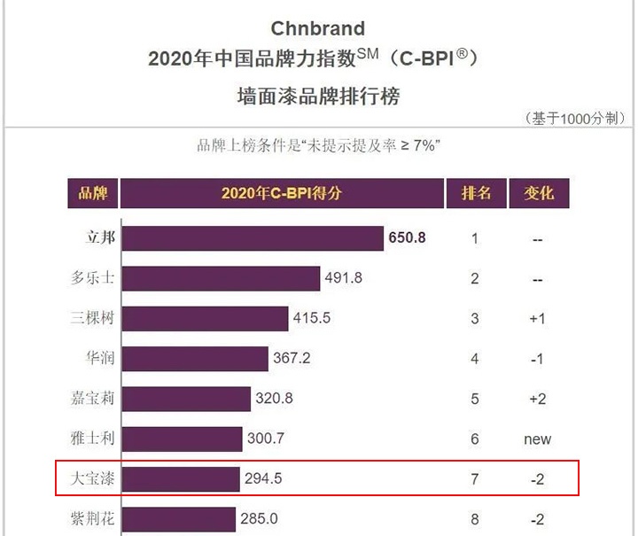 4月22日,中國領先的品牌評級權威機構Chnbrand通過官網發布了2020年(第十屆)中國品牌力指數(C-BPI)品牌排名和分析報告。在激烈的品牌力競爭中,大寶漆脫穎而出,再一次登上墻面漆、木器漆兩大品牌力指數排行榜單。
