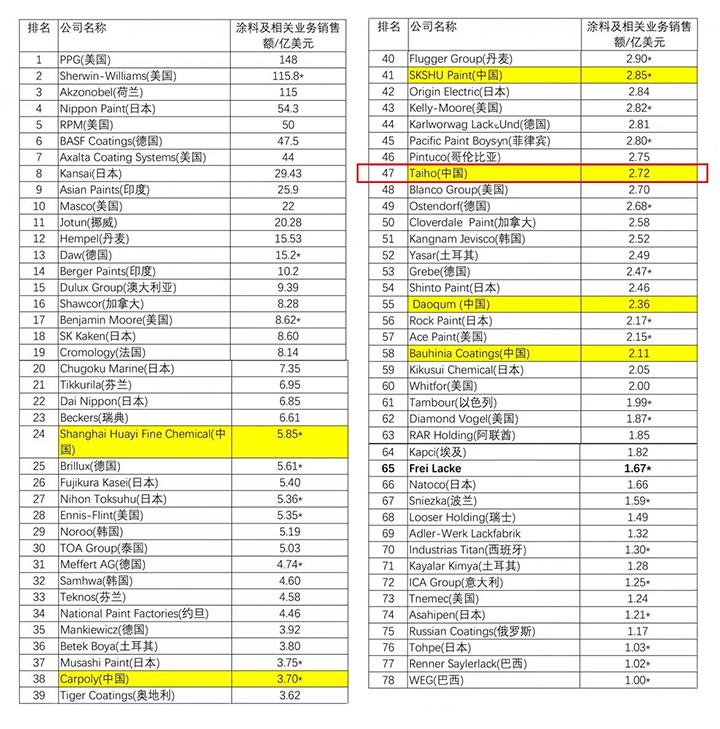 日前,美國Coatings World雜志(July 2018)最新發布2018年全球頂級涂料制造企業銷售額排行榜(前78名)(2018 Top Companies),中國6家涂料企業殺入重圍,比上年增加1家。作為中國著名涂料品牌,大寶漆連續多年登上該排行榜,此次在榜單中位列第47名,較上年提升8名。